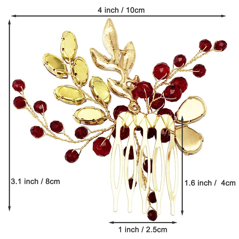 - 【Handmade Design】- This bridal hair piece is hand wrapped by gold color alloy vine with no-fade wine red rhinestone and 3D leaf on gold color pins comb, elegant and easy to wear, good assistant for your make up and easy to DIY your own hairstyle