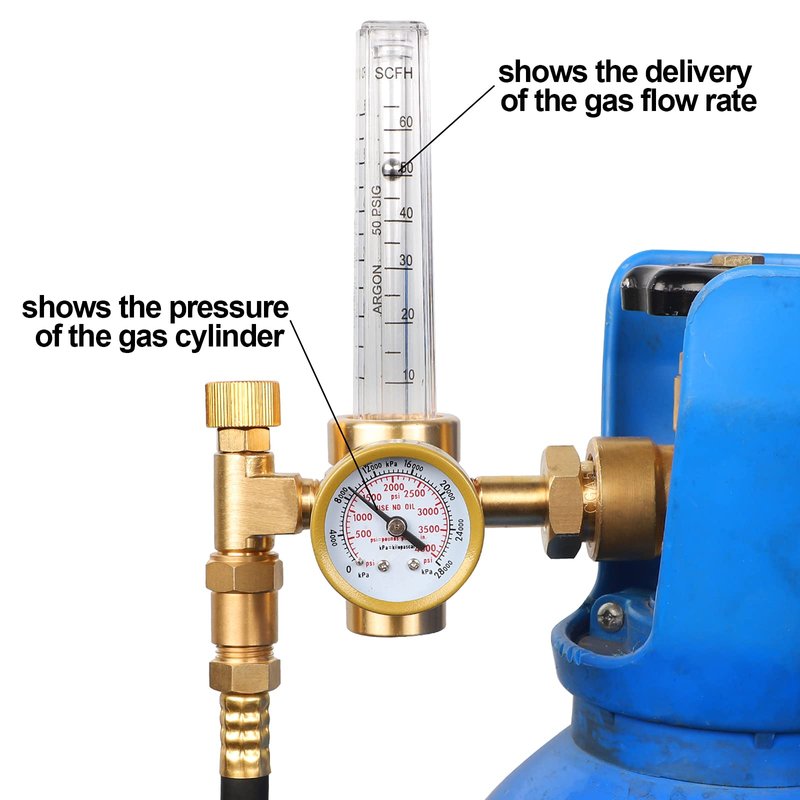 Flow Meters are more accurate than the flow gauge regulators. The pressure gauge which shows how much gas is left in the tank goes from 0 to 4000 psi.