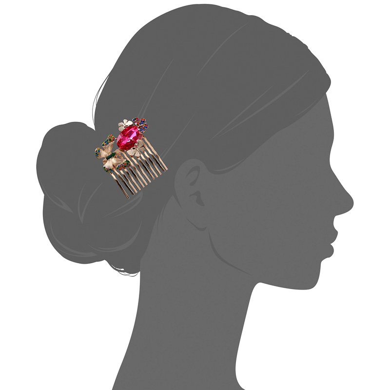 - gold tone hair comb with oval-shaped fuchsia stone and textured butterflies embellished with mixed multi-colored stone accents