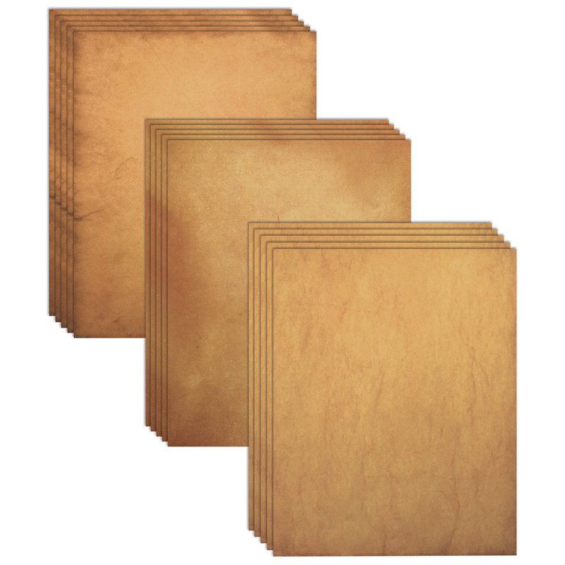 - 48-PACK - Letter size, 8.5" x 11" double-sided weathered-look faux parchment printed in 3 light-to-medium colored designs that allow your handwritten notes or printed text to standout