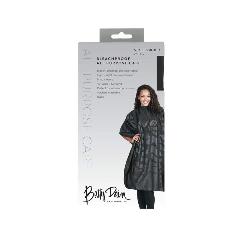 - IMPERVIOUS TO BLEACH: This incredible cape from Betty Dain is the first of its kind - Bleach Proof! Each cape is coated with a material that defends against bleach stains. Splashes and spills are no longer a concern when your clients are undergoing a bleach treatment! It's a salon essential!