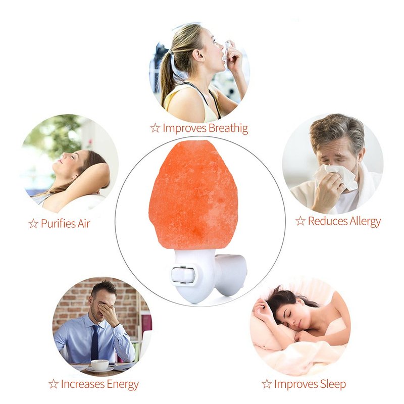 Heat from the bulb causes the salt to emit negative ions which are scientifically proved to purify air, improve breath and reduce allergy and asthma symptoms. These negative ions also combat electro-smog caused by the electronic devices.