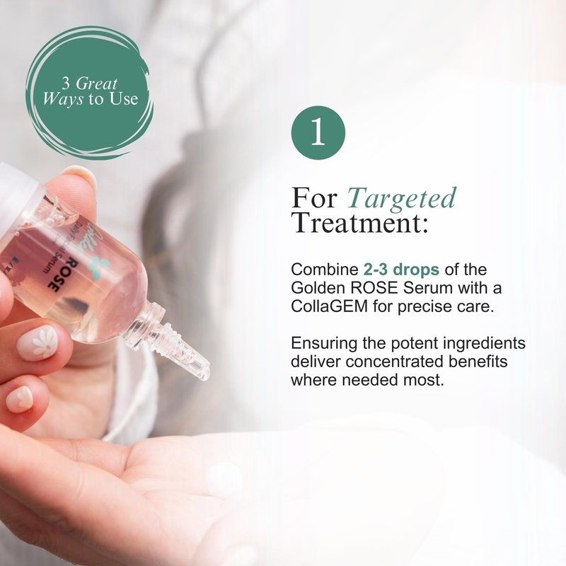 Reveal your skin's timeless beauty with Bevanni Golden ROSE Serum+ CollaGEMS, your ultimate solution for a youthful and radiant complexion. Our serum is crafted with care, featuring pure Rose Essential Oil infused with Colloidal Gold, Hyaluronic Acid, and Vitamin C. This potent combination of ingredients is designed to rejuvenate your skin, diminish fine lines, and restore a natural glow. But the secret to our serum's effectiveness lies in our unique Dry Collagen balls. Unlike other products that merely sit on the surface, our Collagems penetrate deep into your skin cells, delivering collagen where it's needed most. This process promotes moisture retention, leaving your skin supple and hydrated. Each bottle of Bevanni Golden ROSE Serum+ CollaGEMS is a testament to our commitment to quality. We use only the finest ingredients, including vegan collagen, to ensure your skin receives the care it deserves. Indulge in luxury skincare that delivers real results. Elevate your routine with Bevanni Golden ROSE Serum+ CollaGEMS, and let your skin bloom with timeless beauty. Three Great Ways to Use: 1. For Targeted Treatment: Combine 2-3 drops of the Golden ROSE Serum with a CollaGEM for precise care. This method ensures the potent ingredients directly address areas like the eyes or specific lines, delivering concentrated benefits where needed most. 2. For Full-Face Rejuvenation: Amplify your skin's radiance by mixing up to 10 drops of the serum with a CollaGEM. This dynamic duo synergistically hydrates, plumps, and revitalizes your skin, offering an unparalleled skincare experience from forehead to chin. 3. Serum Solo: For days when simplicity calls, use the Golden ROSE Serum on its own. Its blend of Purified Water, Purzorb Rose Oil, Colloidal Gold, Hyaluronic Acid, and Vitamin C hydrates, soothes, and reduces visible signs of aging, leaving your skin smooth and luminous.