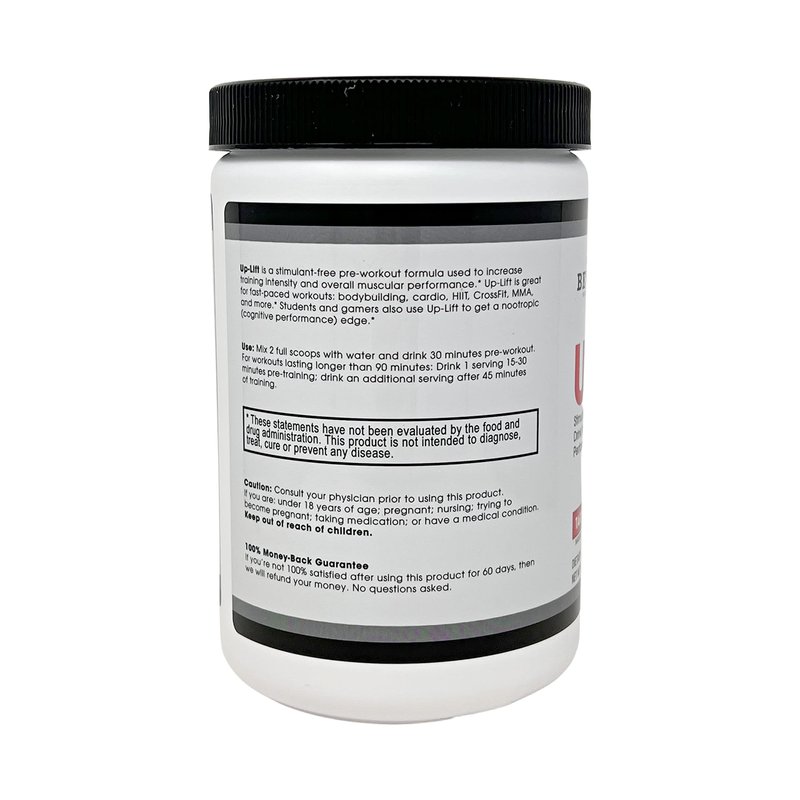 - Enter Up-Lift. It electrifies your mind and muscles, puts you in the mood for a great workout, and encourages blood flow where you need it, all without caffeine. You can use it before (pre-) or during (intra-) workouts. Unlike pre-workout products that contain caffeine or other CNS stimulants, Up-Lift doesn’t produce tolerance, nor is it habit-forming. It feels great the first time, and the thirty-first time. Keep your energy flowing.