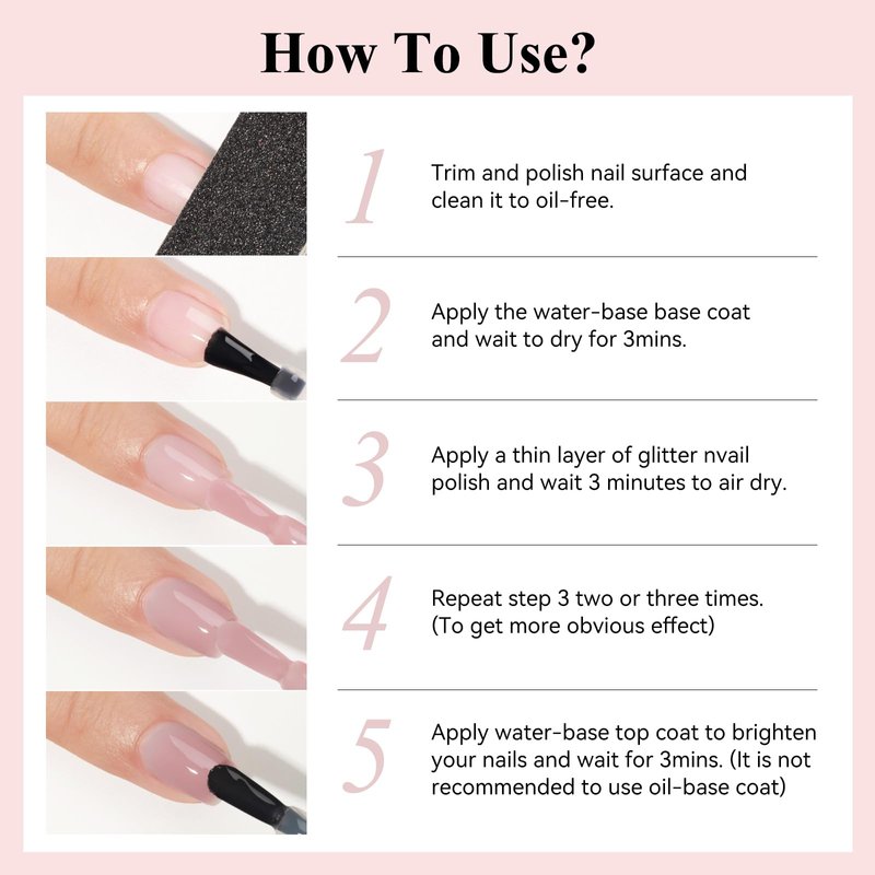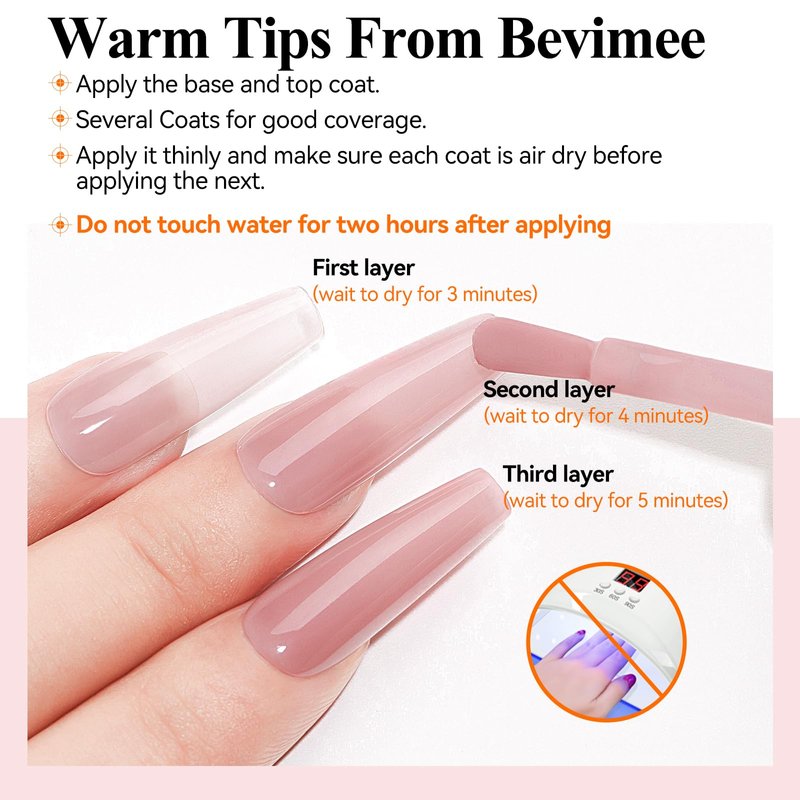 - Warm Tips From Bevimee Nails: 1 Apply multiple coats thinly to get the effect like the pictures; 2 Apply the base and top coat; 3 Apply thinly and each layer is air dry before applying the next; 4 Avoid any water for 2 hours after applying the polish