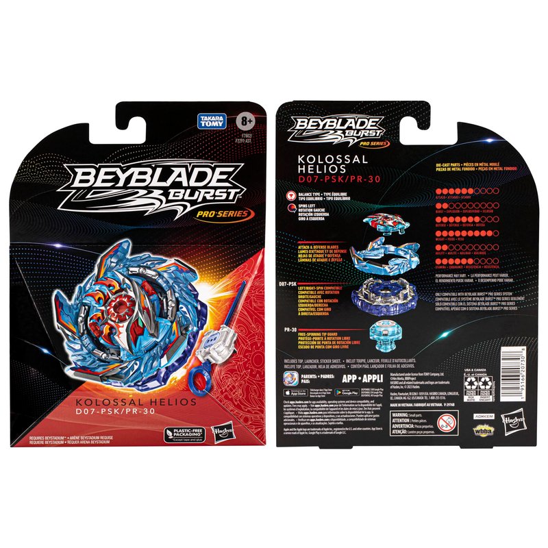 - AUTHENTIC JAPANESE-INSPIRED TOP: The Beyblade Burst Pro Series line features tops with original Takara Tomy Superking top design and deco as sold in Japan. Includes left-spin balance type battling top Kolossal Helios D07-PSK PR-30 with authentic components. Comes with left-spin launcher and sticker sheet (right-spin launcher sold separately, subject to availability)