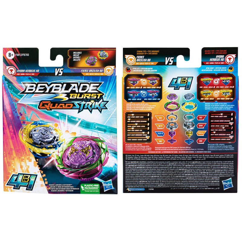 - 2 CUSTOMIZABLE TOPS: Includes Beyblade Burst QuadStrike left-spin Fierce Bazilisk B8 G03 QD10 TA25-Q S08 and right-spin Hydra Kerbeus K8 G02 QD06 TS23-Q B08. Customize top to Core and Apex mode or to Core+ and Apex+ mode to change top type