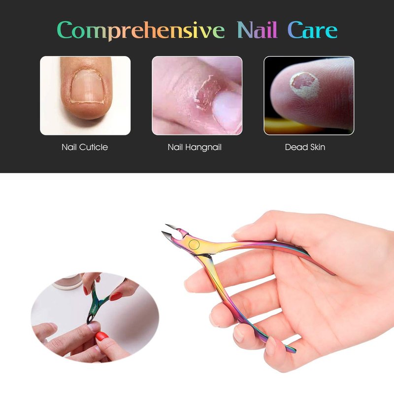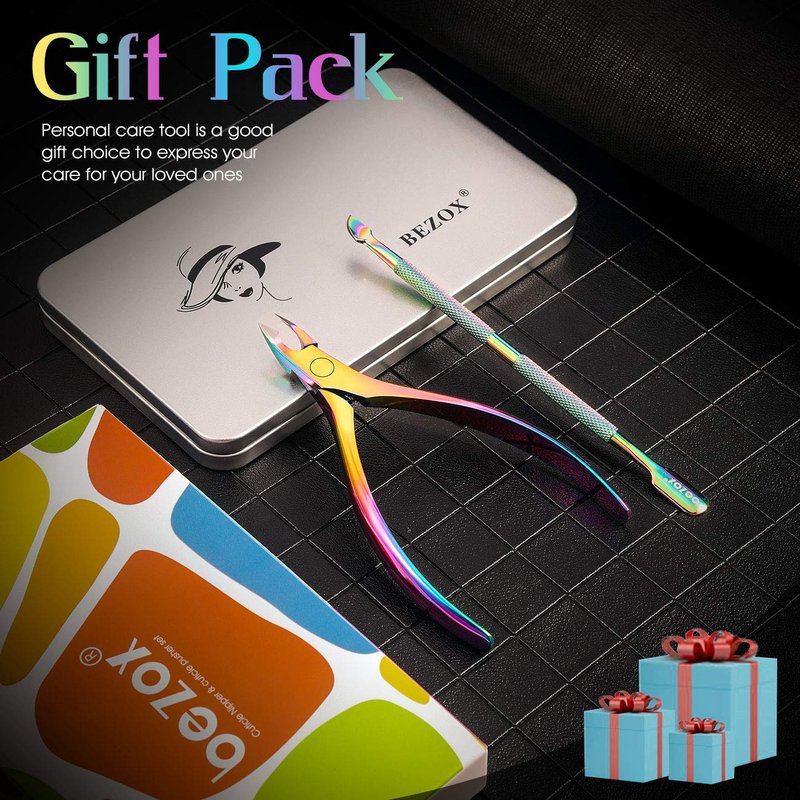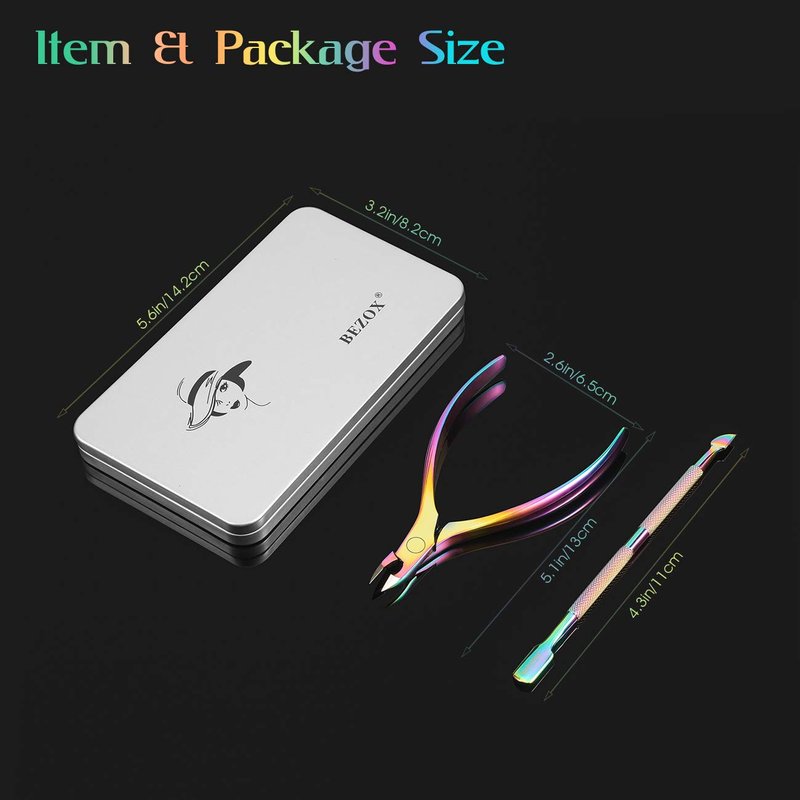 BEZOX Cuticle Clippers with Cuticle Pushers Set - Precise Cuticle Nipper and Under Nail Cleaner Kit for Salon or Home Use - Rainbow Stainless Steel Cuticle Tools