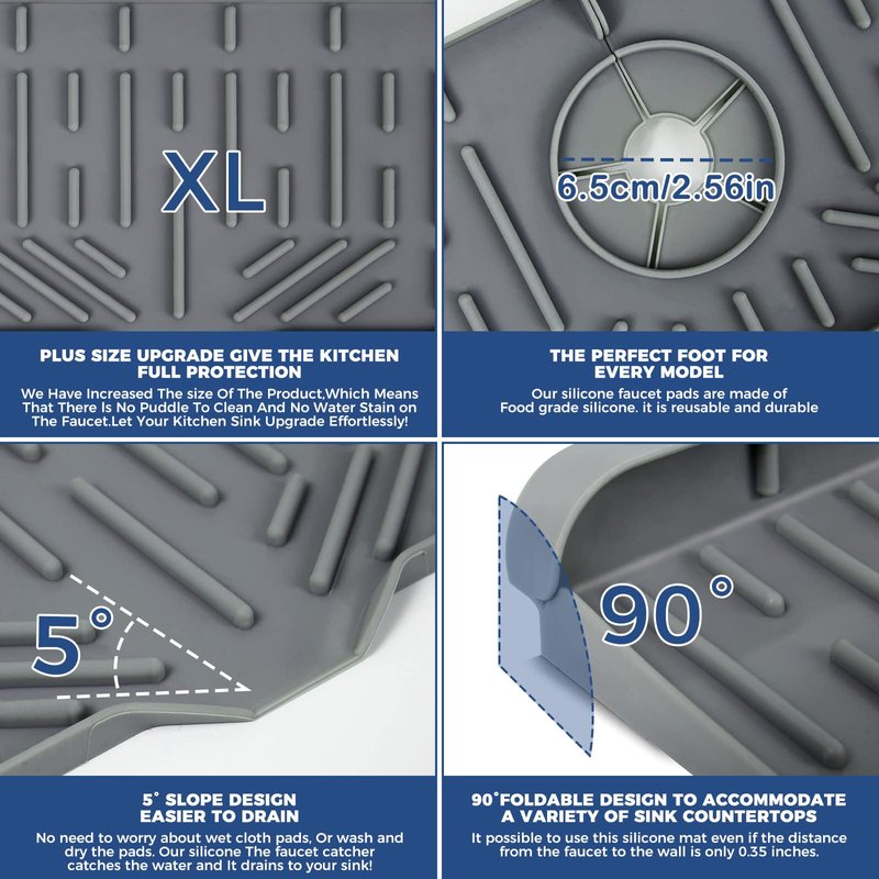 - 💪【5° UPGRADE VERSION】 Silicone faucet mat with upgraded 5° slope design, the kitchen faucet splash guard allows captured water to flow into the sink faster, resulting in faster drying of the kitchen sink. This means never gets soggy, or not having any water spots by the sink faucet. You don't need to worry about the water staying on the sink & bathroom counter. Upgrading your kitchen sink & bathroom countertop in an effort-saving way!