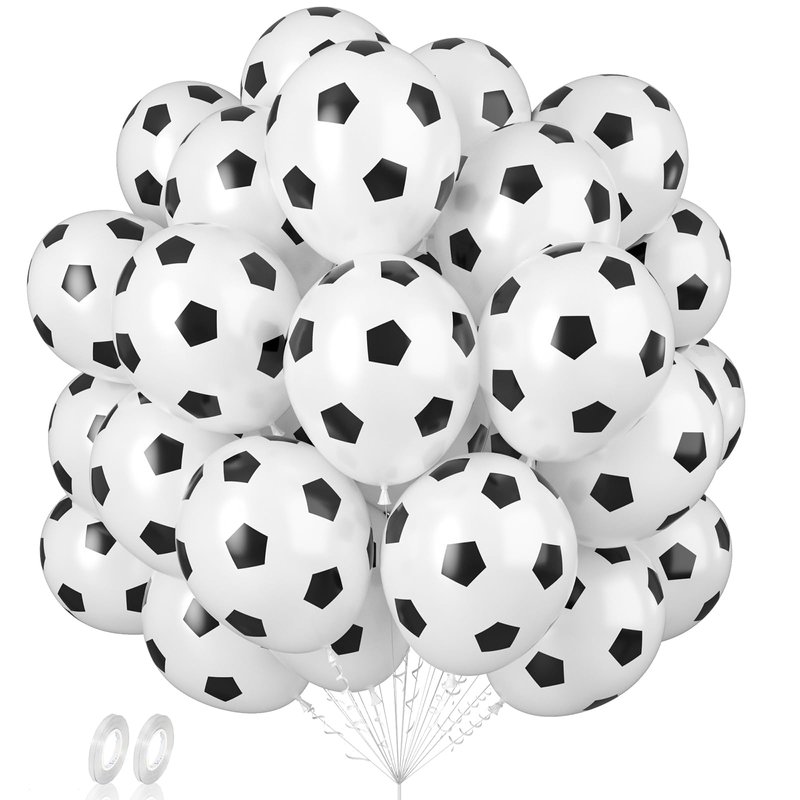 - 60PCS FOOTBALL BALLOON SET: These 12-inch latex party balloons include 60 football latex balloons and 2 roll of 10m ribbon. These soccer balloons come in a classic contrasting white and black color, adding excitement and festive flair to your soccer-themed party or celebration.