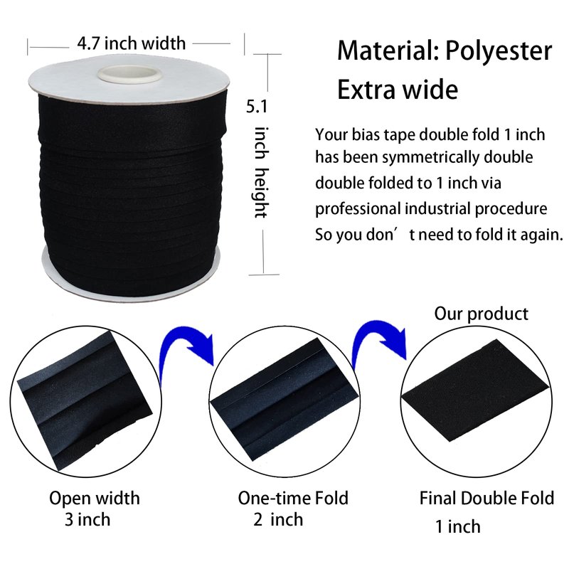 - Wide Range in Application-Our bias tape double fold 1 inch is totally 55 yards(50 metres), 1 inch(25mm) wide; Perfect for your bias tape maker kit, machine and hands; Caters for your different requirement of sewing, trimming, binding straight and curved raw edges, hemming, apparel making and material for sewing masks, Christmas apron, surgical caps, ties, baby quilt, pot holders, bedspread, place-mats, mugs, tent, etc.