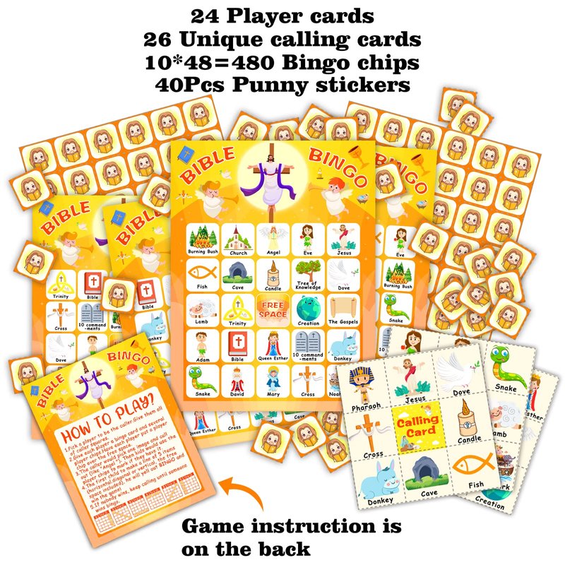 Product descriptionSpecificationQuantity: 39 pieces package includes a gift box for church party favors, a storing bag for the 26 calling cards and the 480 pieces bingo chips, 24 pieces bible bingo cards which supports up to 24 players and 1 caller to play the bible bingo game.Material: Non-toxic and good quality cardboard, HD printing and vibrant colors.Features:1. Bible bingo game for kids toddlers Christian helps letter recognition learning.2. Sunday church activities nativity bingo cards sets can be applied on family open day, vacation bible school, classroom, religious easter gifts, thanksgiving bingo, holiday party favors supplies.3. bible bingo cards for kids contain many meaningful elements such as jesus, adam, eve, Noah's ark, tree of knowledge and so on.How to play:1. Decide the one who holds the bible bingo calling cards.2. Share the bible bingo cards for family open day to the players (up to 24 players).3. When the caller say a letter or the name of one of the calling cards, use the bingo chip to mark it on your own bingo card.4. The first one who gets the five patterns on a line and say BINGO immediately is the winner.5. Winner can get a punny sticker as reward.