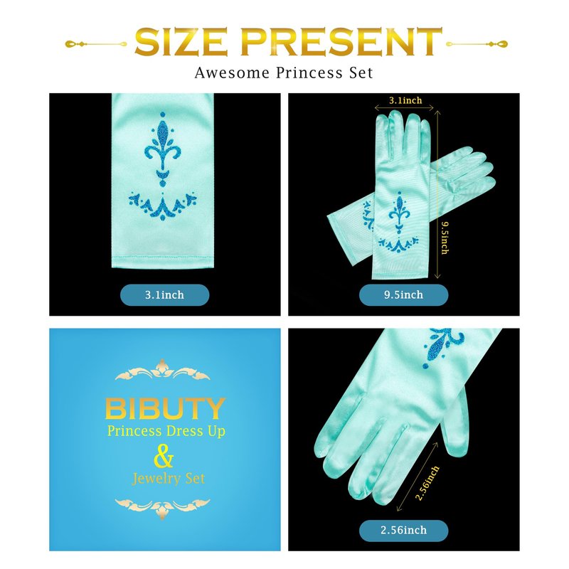 - Princess Gloves for Little Girls: Does your little girl have plenty of princess accessories for girls, but need all the fun items, especially the princess gloves? BIBUTY princess dress up, a hit for imaginative play time with 1 pair of blue gloves for girls. One size toy gift for 3 4 5 6 year old little girls.