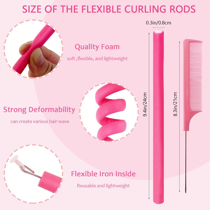 BIEAEIA 60 Pieces Flexible Curling Rods, 9.45 x 0.31 inches Foam Hair Rollers for Long Hair Short Hair Women Girls, No Heat Hair Curlers with Steel Pintail Rat Tail Comb, Pink