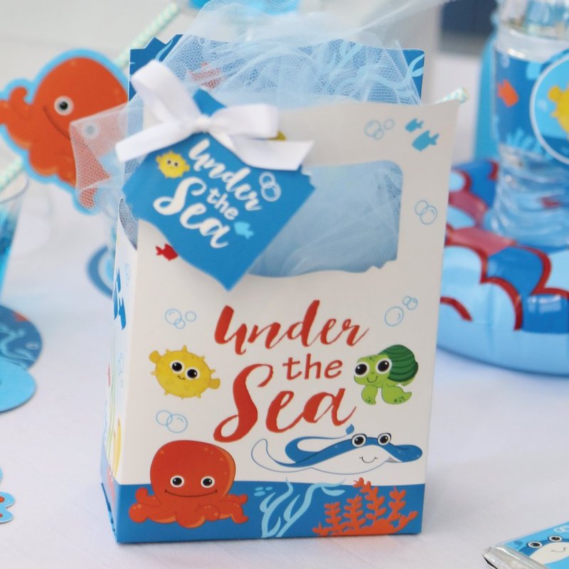 - Under the Sea Critters Favor Boxes INCLUDES 12 sea critters party favor bags, 12 gift tags and coordinating satin ribbon. Classic favor boxes are a party must-have. Under the Sea theme party supplies are great for a baby shower or birthday party.