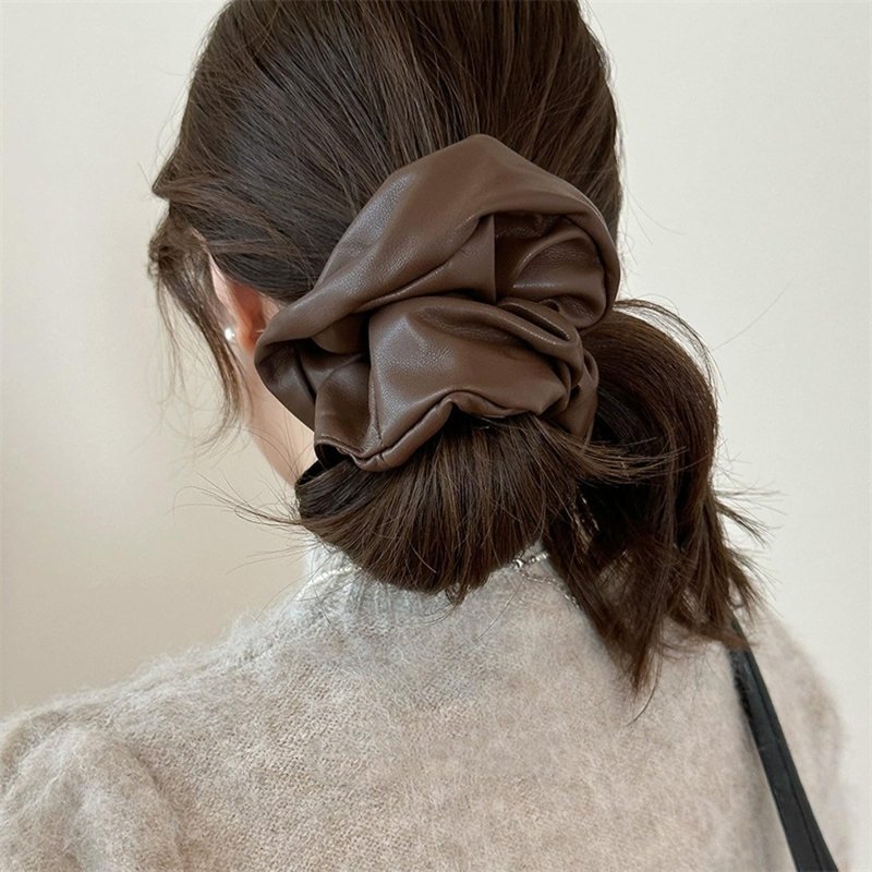 - Jumbo Leather Scrunchies Fashion: These elegant hair ties are made of leather with elastic and have a strong grip. Their leather design and colors render them ideal as satin hair scrunchies for women. They adorn hair gracefully, showing fashion style and beautiful attire