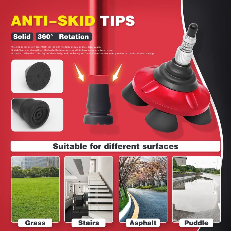 - Stable base: The base of the walking stick is composed of four small stable tips. The rubber base made of tire material is very stable. The base, which can rotate 360 degrees, is made of rigid material and can be used for a long time.