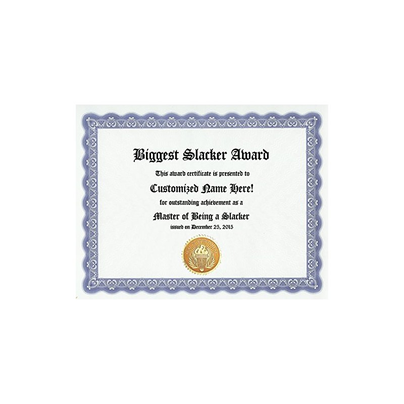 Biggest Slacker Award: Personalized Custom Award Certificate for your Slacker Friend, Lazy Family Member or Co-Worker whose Slacking is Worth a Gag Gift (Funny Customized Present Joke Gift - Unique Novelty Item)