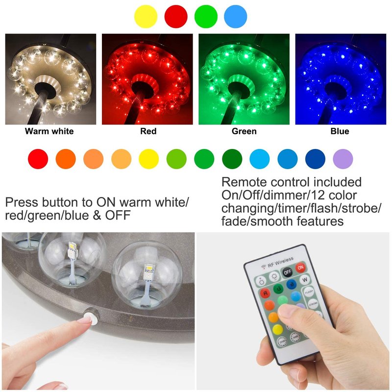 - 【Two Switch Modes of Patio Umbrella light】Turn ON/OFF with the remote control. The umbrella light can be controlled through walls or glasses, the remote detect distance is 80FT. The colors changing and brightness adjust are both controlled by remote. The other way is press the button on the light itself to turn ON/OFF the umbrella light and just can change 4 color: red, green, blue and warm white.