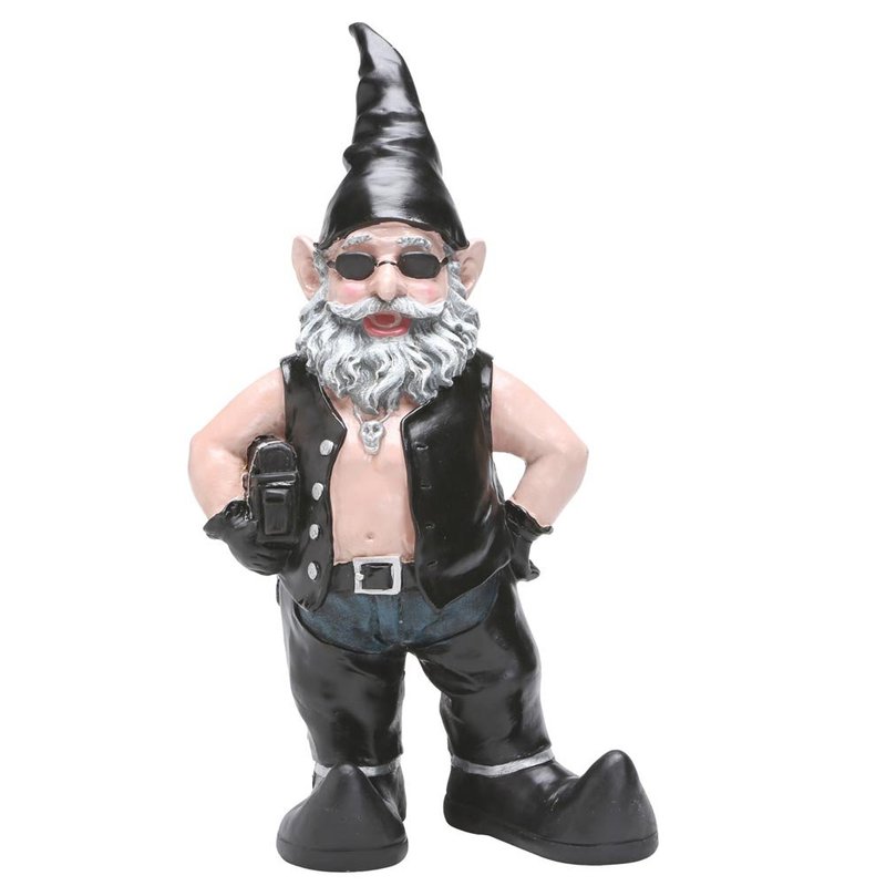 Biker and Biker Babe Combo Set-15" Gnome Statues. "Homestyles - Nowaday Gnomes - Biker Gnomes - 'Biker the Gnome"" wears a leather vest, leather chaps, and blue jeans, his biker boots are naturally curved at the toe as he is a gnome, don't ya' know, and a Nowaday Gnome to-boot! No pun intended. Legend has it; Nowaday Gnomes occupy a parallel universe to our own, living quietly among us, they have mimicked our evolution throughout time, from scavenging for food with rocks and clubs in the ice-age to shopping and sharing emoji's on smartphones and tablets today, they have evolved as we have evolved, done everything we have done, coveted everything we have coveted, and enjoy everything we enjoy, especially ""riding motorcycles!"" Nowaday Gnomes love ""ridining"" which begs the question; who is mimicking whom? A whimsical reminder that ""they"" are living among us. He is holding a saddlebag under his arm. The ultimate collectible home and garden figurine statue for the ""Biker"" or motorcycle enthusiast. He's a great gift for the ""Biker"" in the family or neighborhood. Other key features include; made of durable cast resin, hand painted, suitable for indoor & outdoor use, realistic UV resistant color paint finish, great gift for the gardener, and a great home decor or garden statue.