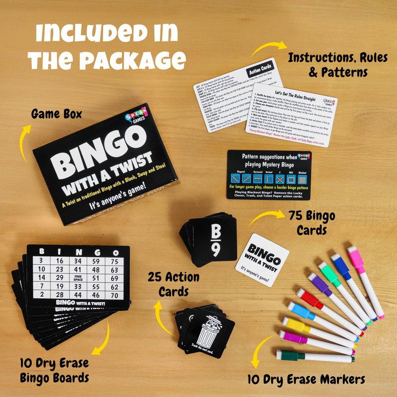 - BINGO WITH A TWIST: Bingo with a Twist is a unique and fun game that puts a new spin on traditional Bingo. It's a family-friendly game with exciting action cards that can block, swap, or steal, Bingo with a Twist keeps players engaged and on their toes. It's Anyone's Game!