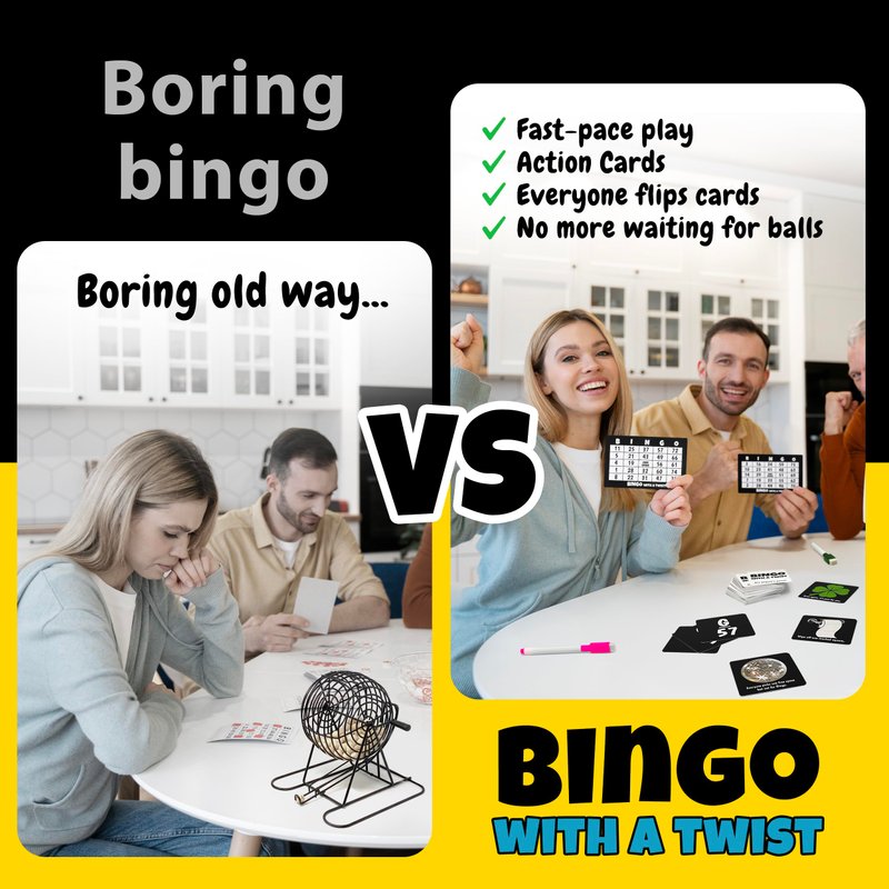 - FUN FOR ALL: Bingo with a Twist is perfect. The action cards add an extra level of excitement and strategy to the game, making it fun for players of all skill levels. Whether you're playing with friends or family, Bingo with a Twist is a great way to spend an evening together.