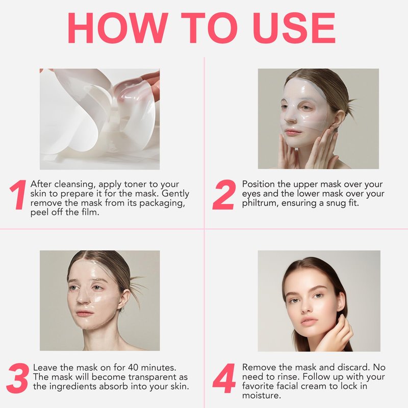 - 【Easy Application】(1) Start with a clean face and follow your usual skincare routine. (2) Open the package and peel off the backing from the mouth part. Apply it around your mouth, smoothing the sides. (3) Remove the backing from the other mask and apply it around your eyes, smoothing it on your skin until flat. (4) Let it absorb for at least 40 minutes or until it becomes transparent, then discard after use.