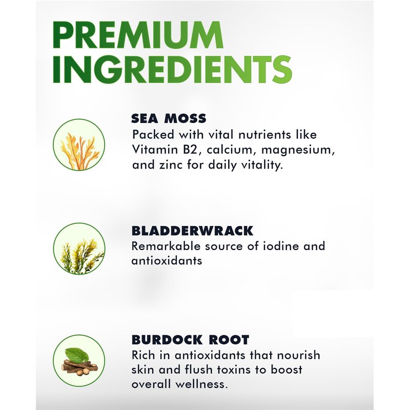 - Promotes Overall Wellness and Boosts Gut welfare. Sea Moss, Bladderwrack and Burdock root contain 92 minerals out of 102 our bodies need including iodine, calcium, potassium, sulfur, zinc, iron, silica, phosphorus, niacin, riboflavin, folate, manganese, choline and copper. Plus Vitamins A B6 C E K D