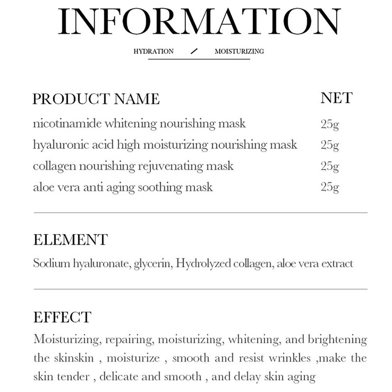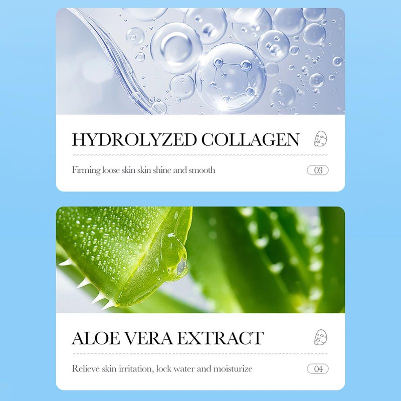 STEP 01 Amino Acid Aloe vera Mild facial cleanser FFICACY: The foam is dense and delicate, which can deeply clean the skin's oily light and dirt, cool and control the oil, and make the skin clear, clean, smooth and not tight after washing. Net: 0.8g STEP 02 Aloe vera Essence Lotion EFFICACY: With aloe essence, it can moisturize and activate skin, balance water and oil, remove free radicals, make skin tender and smooth, and delay skin aging Net: 0.8ml STEP 03 Aloe vera Anti aging Soothing Mask SOOTHING SKIN DISCOMFORT, ANTI WRINKLE AND MOISTURIZING YOUNG SKIN EFFICACY: The Membrane Cloth Is Light, Transparent And Thin, Feels Comfortable When Touching The Skin, Fills The Skin With Moisture And Vitality, Soothes And Protects Dry And Dehydrated Skin, Reduces Skin Shine, And Makes The Skin Soft, Tender And Elastic. Net: 25g HOW TO USE 01. Moisten facial skin slightly, apply proper amount of cleanser to palm, add a small amount of clean water or warm water to make foam, cover face with foam, gently massage facial skin in circles with hand, and fully clean facial skin with warm water. 02. Apply proper amount of lotion evenly on face and gently massage until absorbed. 03. Take out the mask and apply it on the face. Take it off after 15-20 minutes and gently massage the mask until it is absorbed.