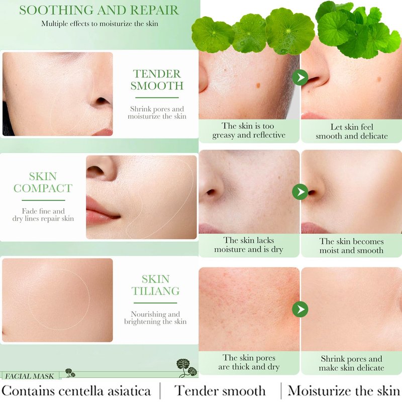 The BIOAQUA Centella Asiatica Moisturizing Facial Mask is a skincare product designed to provide a range of benefits for the face, including moisturization, soothing, repair, oil control, and addressing acne concerns. Here is a detailed description of this face mask: Moisturization: The mask deeply hydrates the skin, leaving it feeling soft, supple, and revitalized. Soothing: Centella Asiatica extract provides a soothing and calming effect, which can be particularly beneficial for those with sensitive or irritated skin. Skin Repair: With consistent use, the mask may help repair and improve the overall condition of the skin, including issues such as dryness and roughness. Oil Control: For individuals with oily skin, the mask can help control excess oil production, reducing shine and the risk of clogged pores. Anti-Acne: It contains ingredients that target acne-prone skin, helping to prevent and alleviate acne breakouts. Usage: Apply the mask to clean, dry skin, ensuring it adheres to your face. Leave it on for the recommended duration, typically around 15-20 minutes. Remove the mask and gently massage any remaining serum into your skin. It is typically used 2-3 times a week as part of your skincare routine.