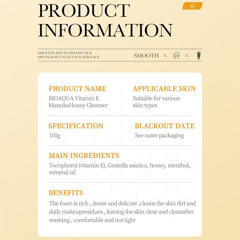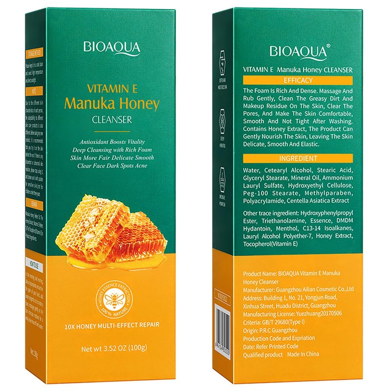 BIOAQUA Manuka Honey Facial Cleanser Vitamin E Deep Cleansing Foam Face Skin Repair Soften Moisturizing Hydrating 3.52oz/100g