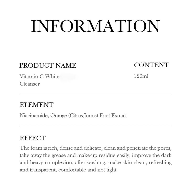The foam is rich, dense and gentle, cleanses and penetrates the pores, easily removes grease and makeup residues, improves a dark and heavy complexion, after washing makes the skin clean, refreshing and transparent, comfortable and not tight. Specifications: 1. Moisturize and clean the skin, eliminate depression, and wash off the oil and dirt protective layer on the skin 2. Orange fruit extract contains vitamin C, making skin smoother and younger. 3. Nicotinamide protects skin. 4. Glycerin Moisturizing Facial Water and Skin Care.