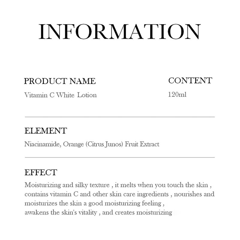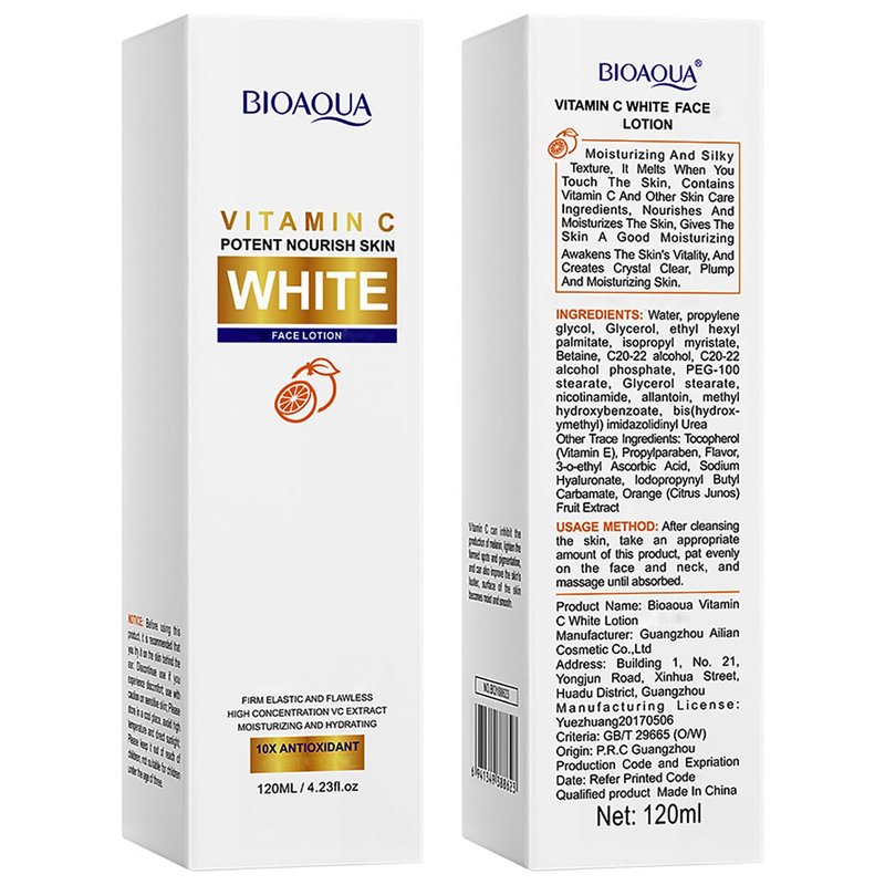 The BIOAQUA Vitamin C White Face Lotion is a skincare product formulated to provide multiple benefits for the face, including, nourishing, moisturizing, and enhancing overall skin hydration. Infused with vitamin C and a pleasant orange scent, this lotion is designed to promote a more radiant and revitalized complexion. Here is a detailed description of this face lotion: Key Ingredients and Features: Vitamin C: Vitamin C is a powerful antioxidant known for its ability, reduce the appearance of dark spots, and promote a more even skin tone. It also helps protect the skin from environmental damage. Nourishing: It contains ingredients that nourish the skin, providing essential nutrients to support overall skin health. Moisturization: The lotion offers deep hydration to the skin, helping to maintain its moisture balance and prevent dryness. Orange Scent: With an orange scent, this lotion provides a refreshing and invigorating sensory experience. Size: Each package contains 120ml (4.06fl.oz) of face lotion, providing a generous amount for regular use. Benefits and Usage: The presence of vitamin C helps reduce the appearance of dark spots or uneven skin tone. Nourishing: The lotion nourishes the skin, leaving it feeling healthy and revitalized. Moisturization: Deep hydration helps maintain skin moisture levels, preventing dryness and discomfort. Refreshment: The orange scent provides a refreshing and energizing sensation when applied to the skin. Usage: Apply an appropriate amount of the lotion to your face and neck, then gently massage it in using upward and outward motions. It is typically used as part of your daily skincare routine, both morning and evening, after cleansing.