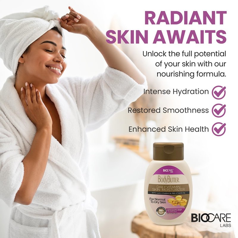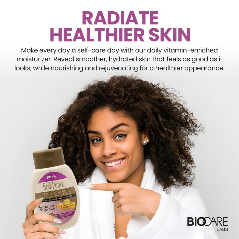 Vitamin E, Pro-Vitamin B5, Alpha-Bioplex Daily Vitamin Skin Moisturizer Dermatologist Tested “Your Vitamin A Day.” Your skin needs vitamins every day to stay healthy, soft and moisturized. This vitamin enriched BodyButter is your daily therapeutic dose of protective restorative and deep penetrating moisturizer to help keep your skin in optimal condition. This perfectly balanced formula, whipped with our exclusive Alpha-Bioplex will support your skin to stay in its best shape. Benefits: Deep Hydration & Protection All Day Moisture For Smoother Skin Enhanced with unique Alpha-Bioplex - Biocare’s unique blend of natural fruit and plant extracts. Vitamin E, Pro-Vitamin B5, Alpha-Bioplex Daily Vitamin Skin Moisturizer Dermatologist Tested “Your Vitamin A Day.” Your skin needs vitamins every day to stay healthy, soft and moisturized. This vitamin enriched BodyButter is your daily therapeutic dose of protective restorative and deep penetrating moisturizer to help keep your skin in optimal condition. This perfectly balanced formula, whipped with our exclusive Alpha-Bioplex will support your skin to stay in its best shape. Benefits: Deep Hydration & Protection All Day Moisture For Smoother Skin Enhanced with unique Alpha-Bioplex - Biocare’s unique blend of natural fruit and plant extracts. Directions: Apply a generous amount into hands, rub together and massage into skin paying special attention to dry areas. Use daily after bathing, showers or as needed to hydrate, moisturize and help protect your skin. Warning: For external use only. Avoid eye contact. Keep out of reach of children.