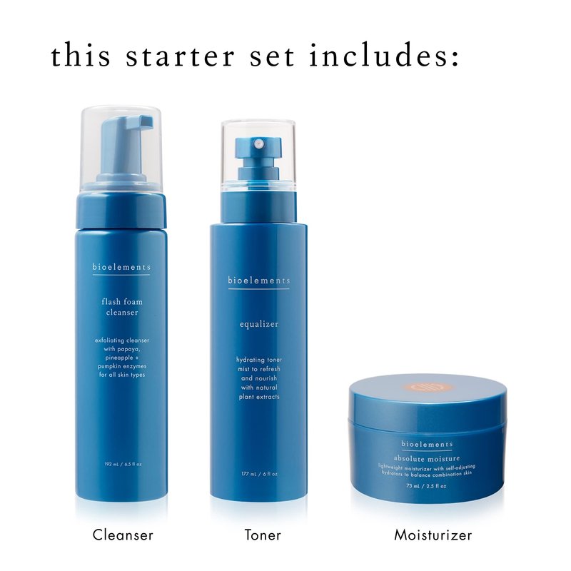 Bioelements 3-Step Starter Set: Combination Skin - Includes Flash Foam Cleanser, Equalizer Toner & Absolute Moisture Moisturizer - Vegan, Gluten Free - Never Tested on Animals