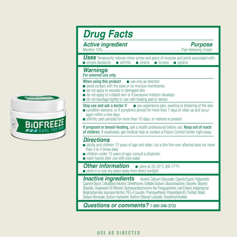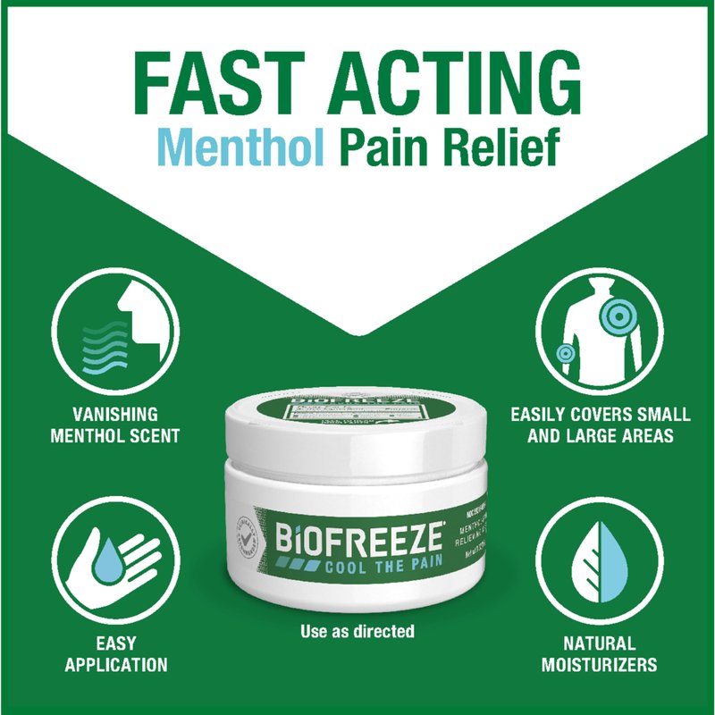 Biofreeze Menthol Pain Relieving Cream with natural moisturizers is well-suited for application on small and large muscle areas. Fast acting and long lasting, cooling menthol formula delivers penetrating pain relief for sore muscles, simple backaches, joint pain, bruises, and arthritis. There is no limit to what you can do when you cool your aches and pains.