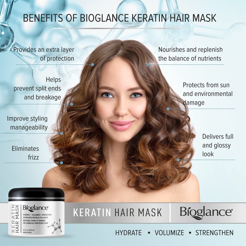 - REPAIRS YOUR HAIR! Bioglance Keratin Hair Mask is specially designed to help your hair recover quickly from any damage, done by chemical products, too much processing or the weather.