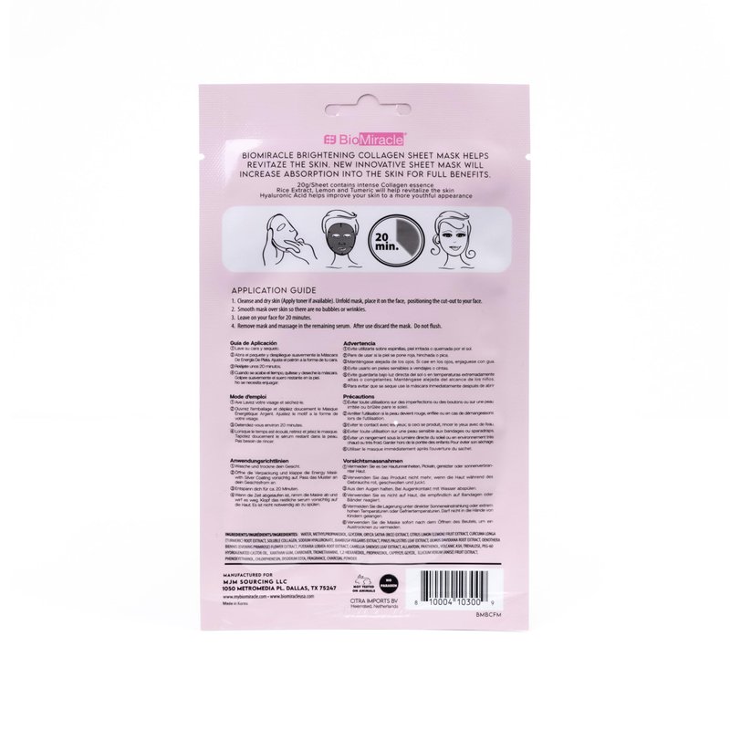 The BioMiracle Revitalizing Collagen Face Mask is a 20 minute treatment to rejuvenate your skin and help diminish the appearance of redness and blemishes, and minimize the appearance of pores. The added collagen and hyaluronic acid helps reduce the signs of aging. With rice extract, lemon, and turmeric, this mask can reduce UV damage, lines, and wrinkles, as well as control and eliminate excess oil. The new innovative design of the sheet mask increases hydration and nourishment absorption into the skin for full benefits. This mask treatment fits easily into every skincare routine. Instructions included on product label.