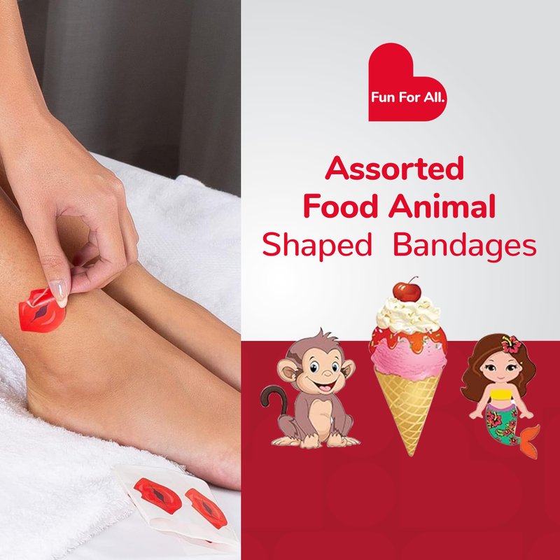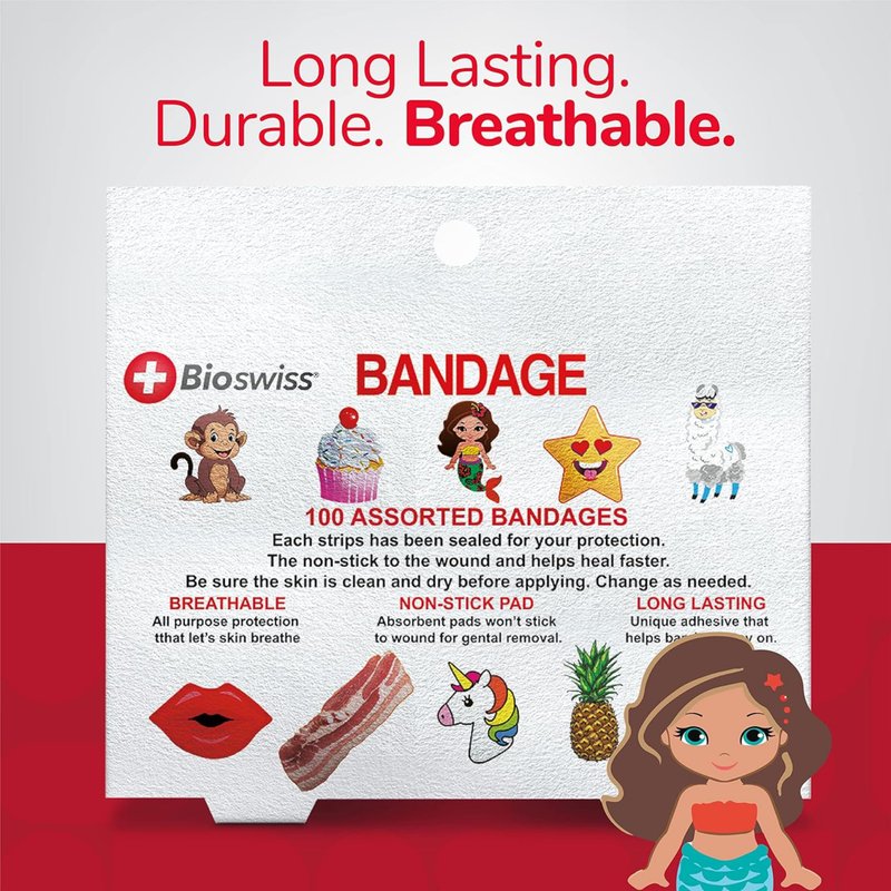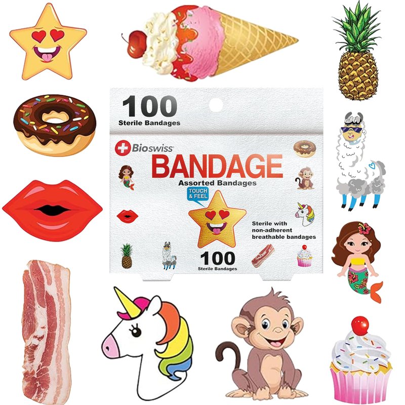 BioSwiss Bandages, Assorted Animal, Fun, and Food Shaped Self Adhesive Bandage, Latex Free Sterile Wound Care, 100 Count