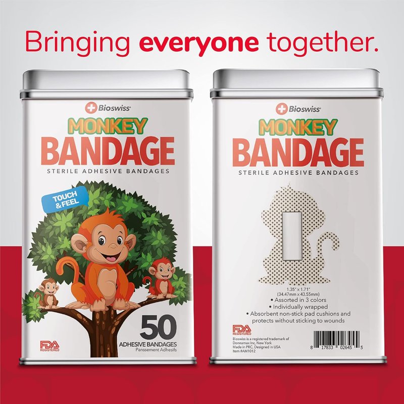 - MONKEY CARTOON BANDAGES: This 50 piece tin of adorable monkey bandages is great for putting a smile on kids' faces while protecting wounds such as cuts, scrapes, and burns, and come in 3 assorted styles; sticky bandages are perfect for kids and adults alike, and also for school nurses and pediatric doctors