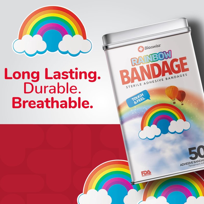 - RAINBOW BANDAGES: This 50 piece tin of funny rainbow bandages is great for putting a smile on kids' faces while protecting wounds such as cuts, scrapes, and burns; sticky bandages are perfect for kids and adults alike, and also for school nurses and pediatric doctors