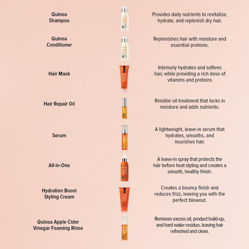 - No Parabens, Sodium Chloride, or SLS/SLES – Our 911 Quinoa hair care products are formulated to provide in-depth hair repair for dry, damaged hair. Our products are made with active ingredients, are always pH balanced for hair & scalp powered by superfood quinoa, keratin, argan oil & more.