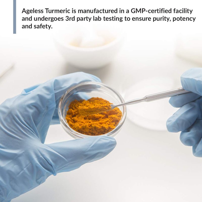 - GMP QUALITY GUARANTEE. Ageless Turmeric pills are manufactured in a GMP-certified facility and undergo 3rd party lab testing to ensure purity, potency and safety.