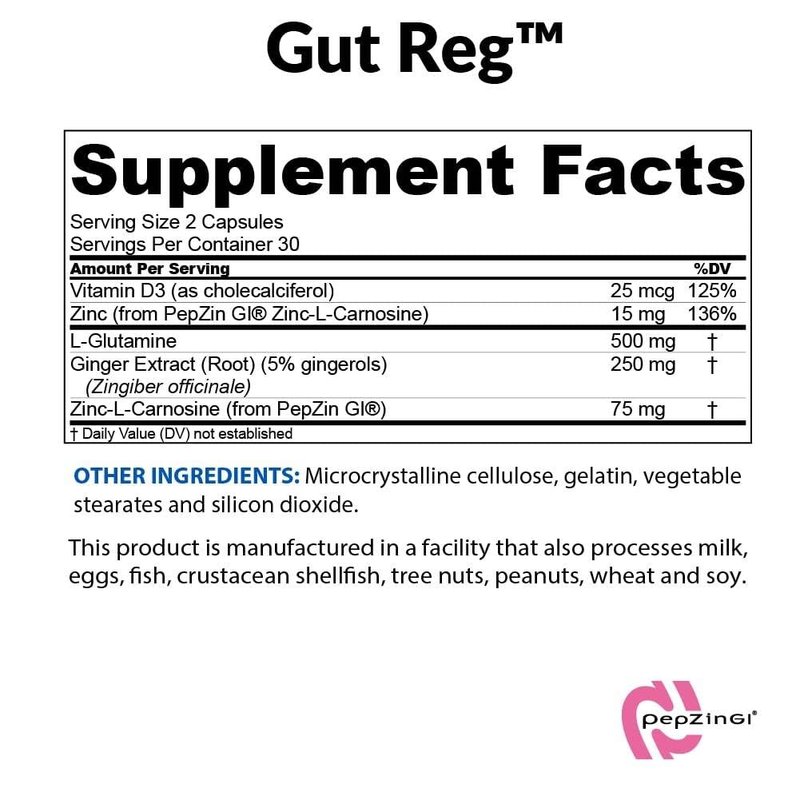 - SUPPORT A HEALTHY GUT LINING. Signs of a weak, leaky gut lining including occasional heartburn, nausea, bloating, gas, upset stomach, irregularity, joint problems, fatigue, headaches, skin issues, mood issues, brain fog, sleep problems, out-of-control cravings and more. With the gut-nourishing ingredients PepZin GI and L-Glutamine, Gut Reg supports a healthy gut lining and gut barrier integrity.