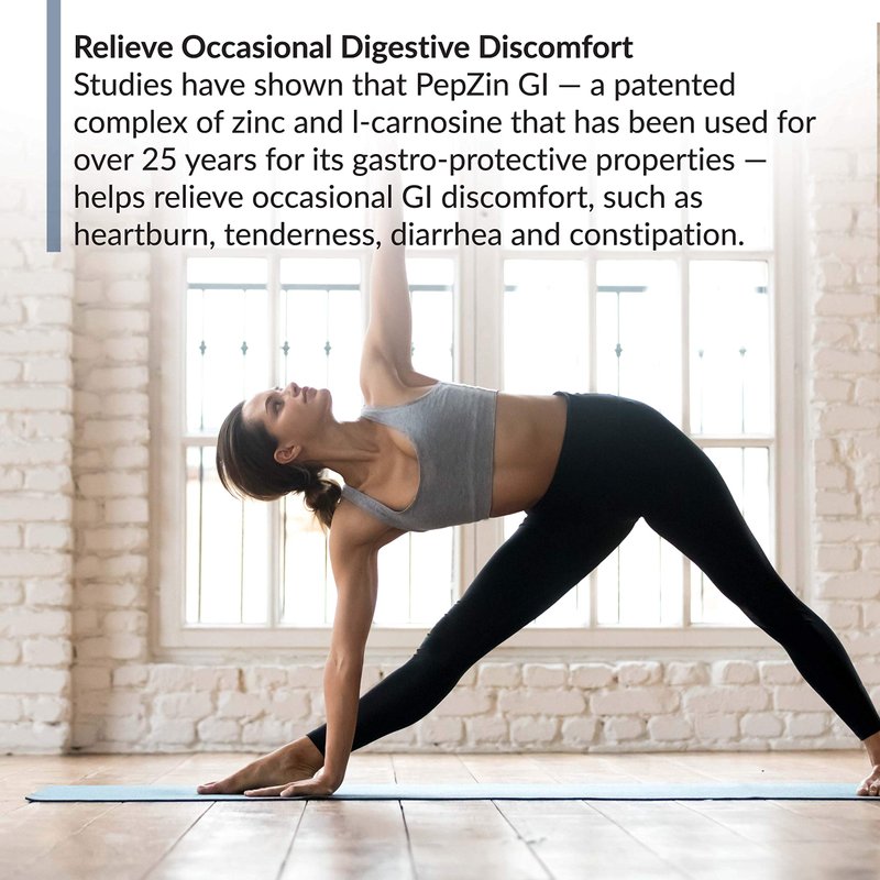 - RELIEVE OCCASIONAL DIGESTIVE DISCOMFORT. Studies have shown that PepZin GI -- a patented complex of zinc and l-carnosine that has been used for over 25 years for its gastro-protective properties -- helps relieve occasional GI discomfort, such as heartburn, tenderness, diarrhea and constipation.