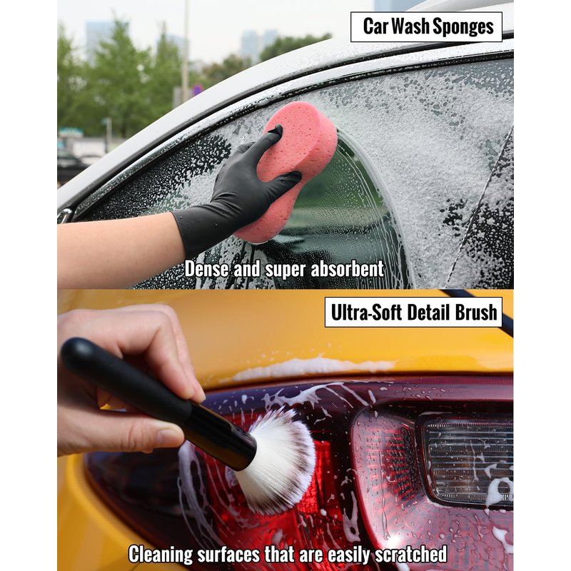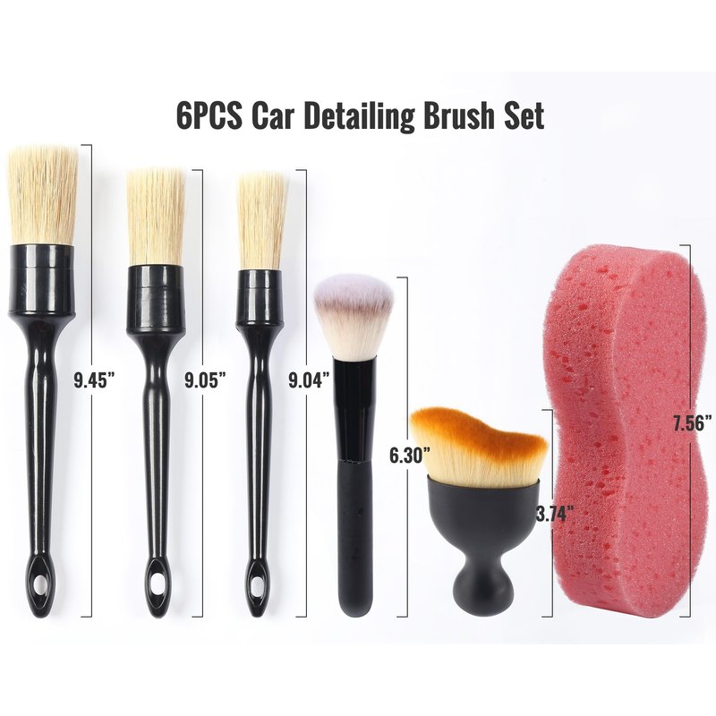 - 【Multi-functional & Various Size】6 Pcs car detailing kit, 1 set to meet your cleaning needs. Including natural boars hair detailing brushes * 3, dusting brush * 1, ultra-soft detail brush * 1, car wash sponges* 1. Excellent completion of all works required for external and internal details! This brush set can also be used for washing your kitchen, toilet, floor, motorcycle, yacht, etc. It is the perfect gift for yourself, for your family, for your friends.