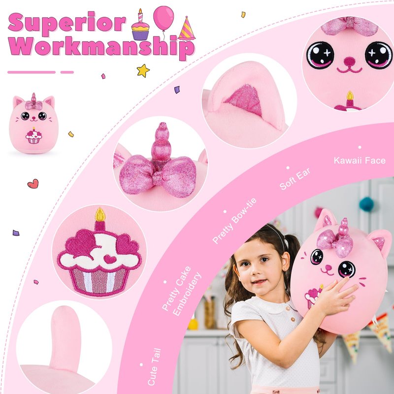 - 🌈【Safety, Softness & Durability Material 】Our birthday pink cat plushie pillow is crafted from stretchy super soft fabric filled with with plump pp cotton, which is 16'' much larger and softer than ordinary, when hold it in your arms, you will feel comfortable and elastic, with a smooth feel and delicate texture. Our fabrics of this kawaii cat plush pillow have passed CPSIA certification ensuring safety and durability enough to withstand thousands of hugs.