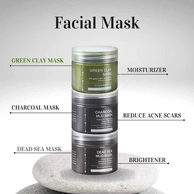 Bisou Bisou Bisou Clay, Dead Sea Mud & Charcoal Gel Face Mask Trio With Applicator, Deep cleansing Clay and Mask Applicator, Facial Therapy PH Balanced Hypo-allergenic