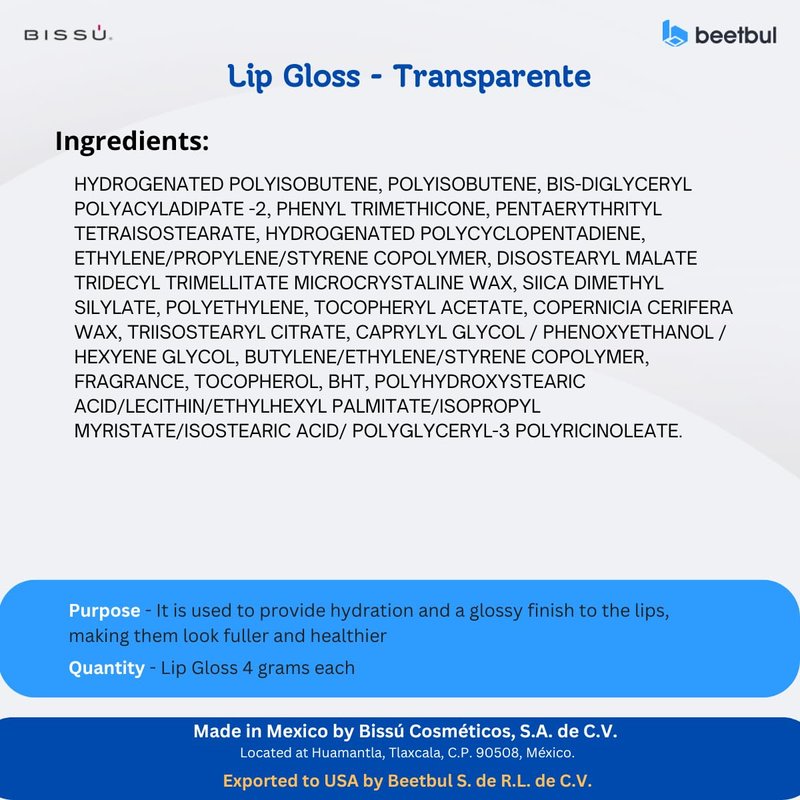 Bissú Transparent Lip Gloss Elixir is a must-have for lip care, combining the nourishing power of 12 natural oils with antioxidant Vitamin E. Its non-sticky, lightweight formula offers a smooth, glossy finish while protecting and hydrating your lips. Dermatologically tested and hypoallergenic, this vegan and cruelty-free gloss is perfect for adding a subtle shine to your lips while keeping them healthy and moisturized. ***** INGREDIENTS: ETHYLHEXYL PALMITATE, CAPRYLIC/CAPRIC TRIGLYCERIDE, WHITE OZOKERITE WAX, TALC, POLYMETHYL METHACRYLATE, KAOLIN, ETHYLHEXYL HYDROXYSTEARATE, SILICA DIMETHYLSILYLATE, ZINC STEARATE, CETYL PEG/PPG-10/1 DIMETHICONE, POLYHYDRO-XYSTEARIC ACID/LECITHIN/ETHYLHEXYL PALMITATE/ISOPROPYL MYRISTATE/ISOSTEARIC ACID/POLYGLYCERVL-3 POLYRICINOLEATE, CAPRYLYL GLYCOL/PHENOXYETHANOL/HEXYLENE GLYCOL, TOCOPHERYL ACETATE. Purpose - It is used to provide hydration and a glossy finish to the lips, making them look fuller and healthier Quantity - Lip Gloss 4 grams each Made in Mexico by Bissú Cosméticos, S.A. de C.V. Located at Huamantla, Tlaxcala, C.P. 90508, México. Exported to USA by Beetbul S. de R.L. de C.V.