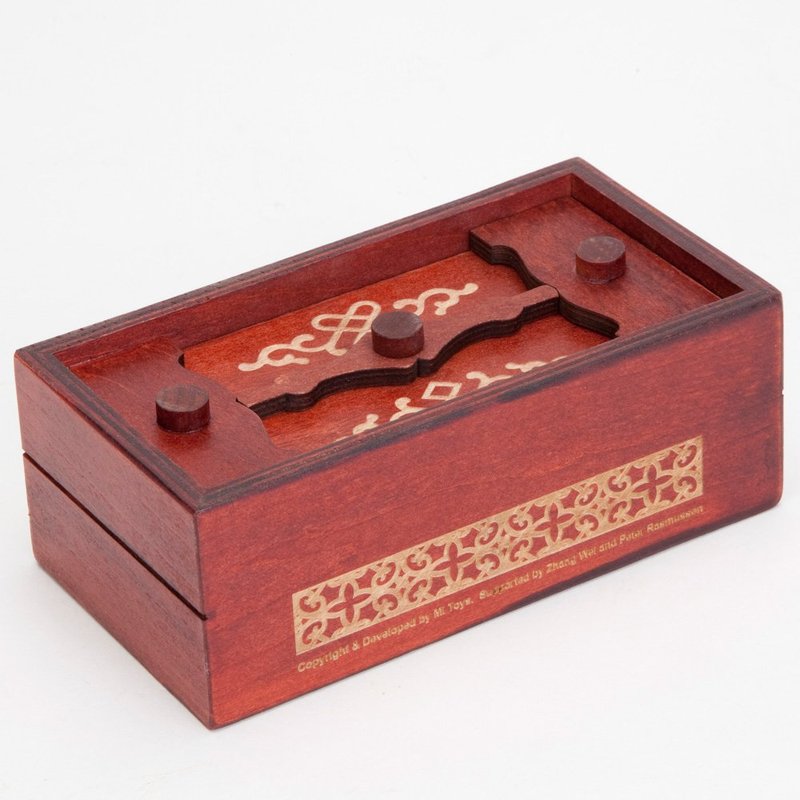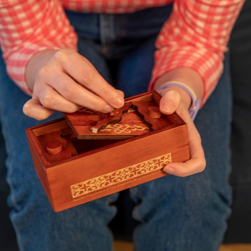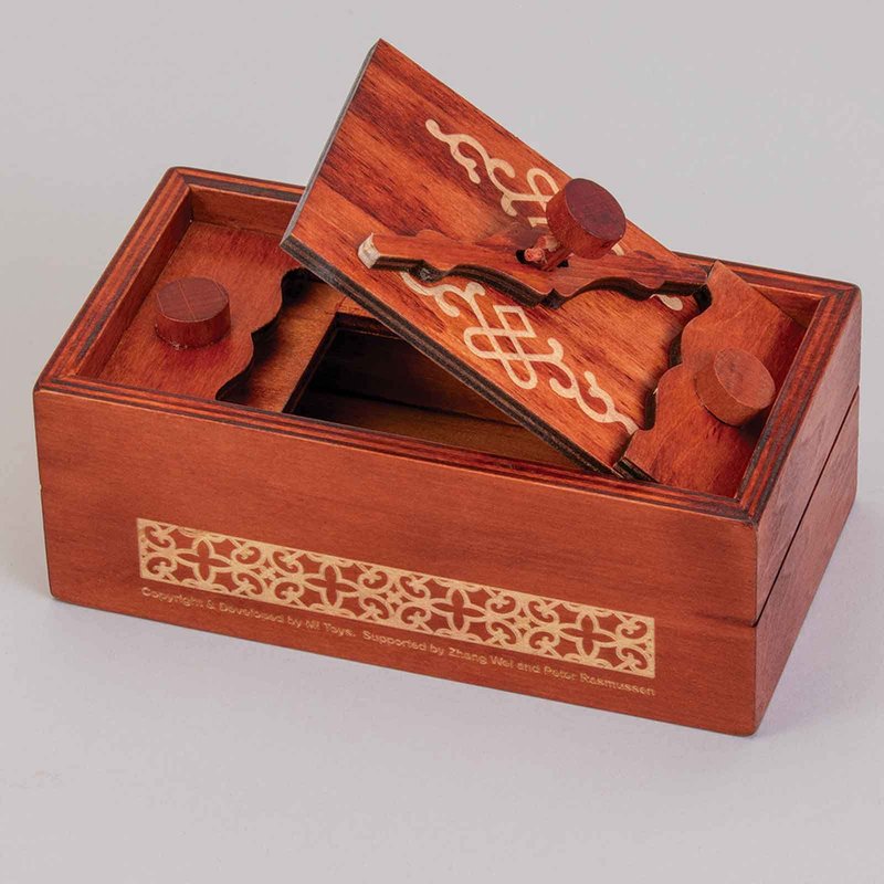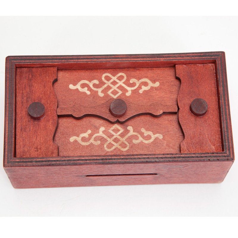 No one will be able to get to your savings using this clever box. Slide your coins and bills through the money slot then look for the challenging solution to open it. Made of pinewood with a rich walnut stain. 5 7/8” x 2 1/8” X 3 1/8”. Solution included.